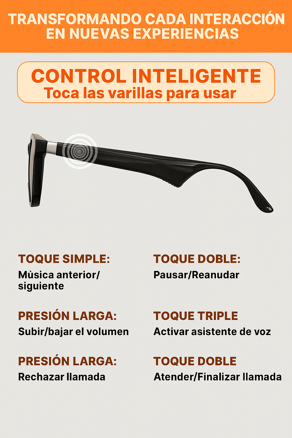 Al adquirirlas, obtienes un dispositivo multifuncional con auriculares de oído abierto, lentes protectores UV o de bloqueo de luz azul (según tus preferencias), una cámara HD integrada y un asistente de voz con IA. Todo esto en un diseño moderno, ligero y elegante que combina estilo con innovación.