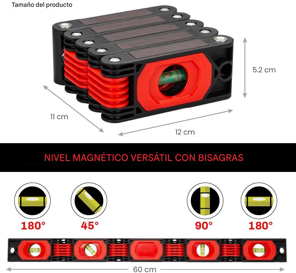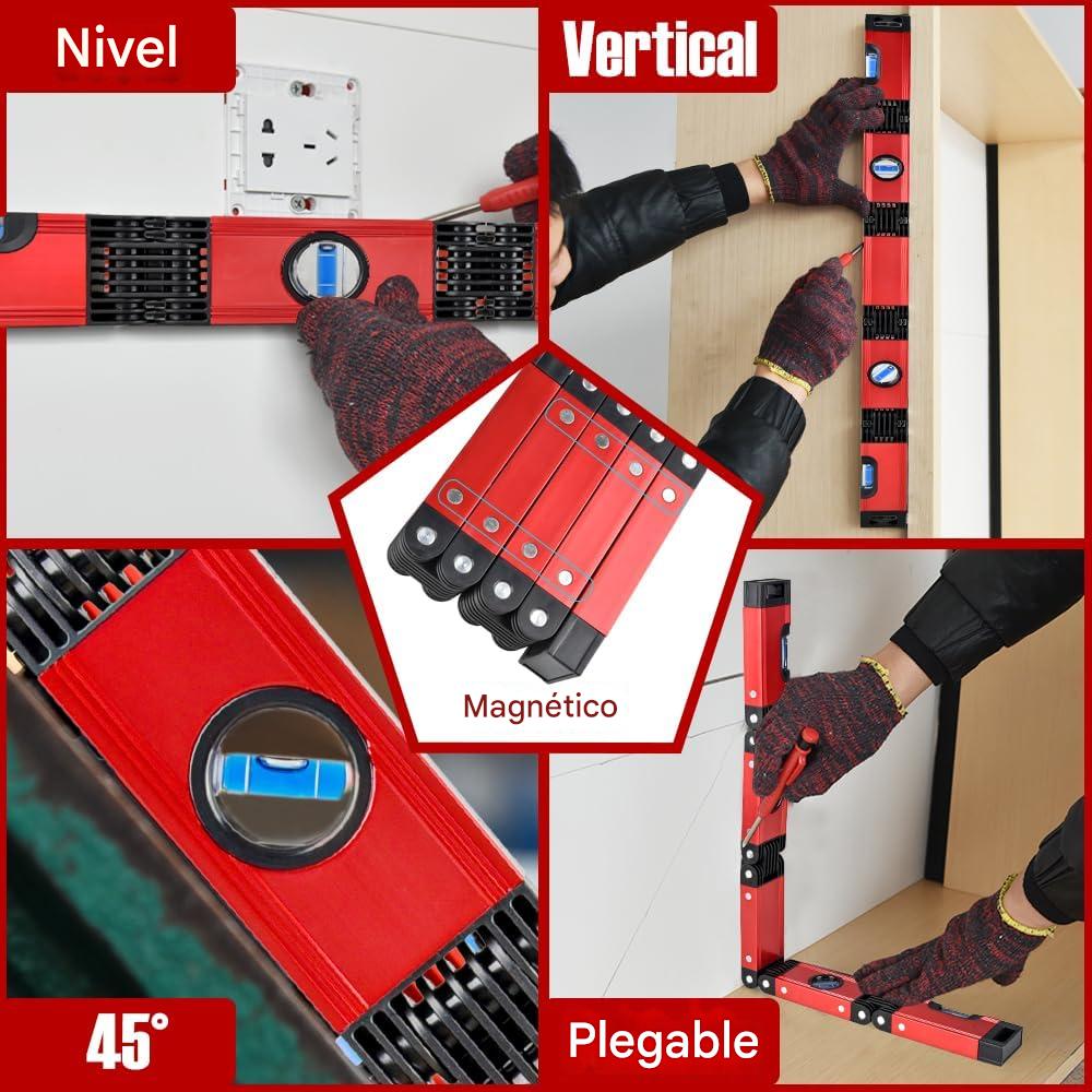 Modo de operación: Manual Material principal: Aluminio anodizado de alta resistencia Material adicional: Conectores ABS y tapas terminales TPR Color: Rojo y negro Dimensiones del producto: 23,6" de largo × 2" de ancho (≈ 60 cm × 5 cm) Peso del artículo: 1,05 libras (≈ 480 gramos) Diseño: Plegable con 5 juntas ajustables Viales de burbuja: 4 (horizontal, vertical, 45°, y multiángulo) Precisión: ±0.020 in/m Base magnética: Sí, con 5 imanes de alta potencia Rango de medición: Ángulos múltiples (0° a 180°) Resistencia: Anticorrosiva, resistente a rayones y caídas leves Uso recomendado: Carpintería, fontanería, albañilería, bricolaje y proyectos de construcción Portabilidad: Compacto y plegable para almacenamiento y transporte fácil Fuente de energía: No requiere batería (manual) Componentes incluidos: Imanes integrados